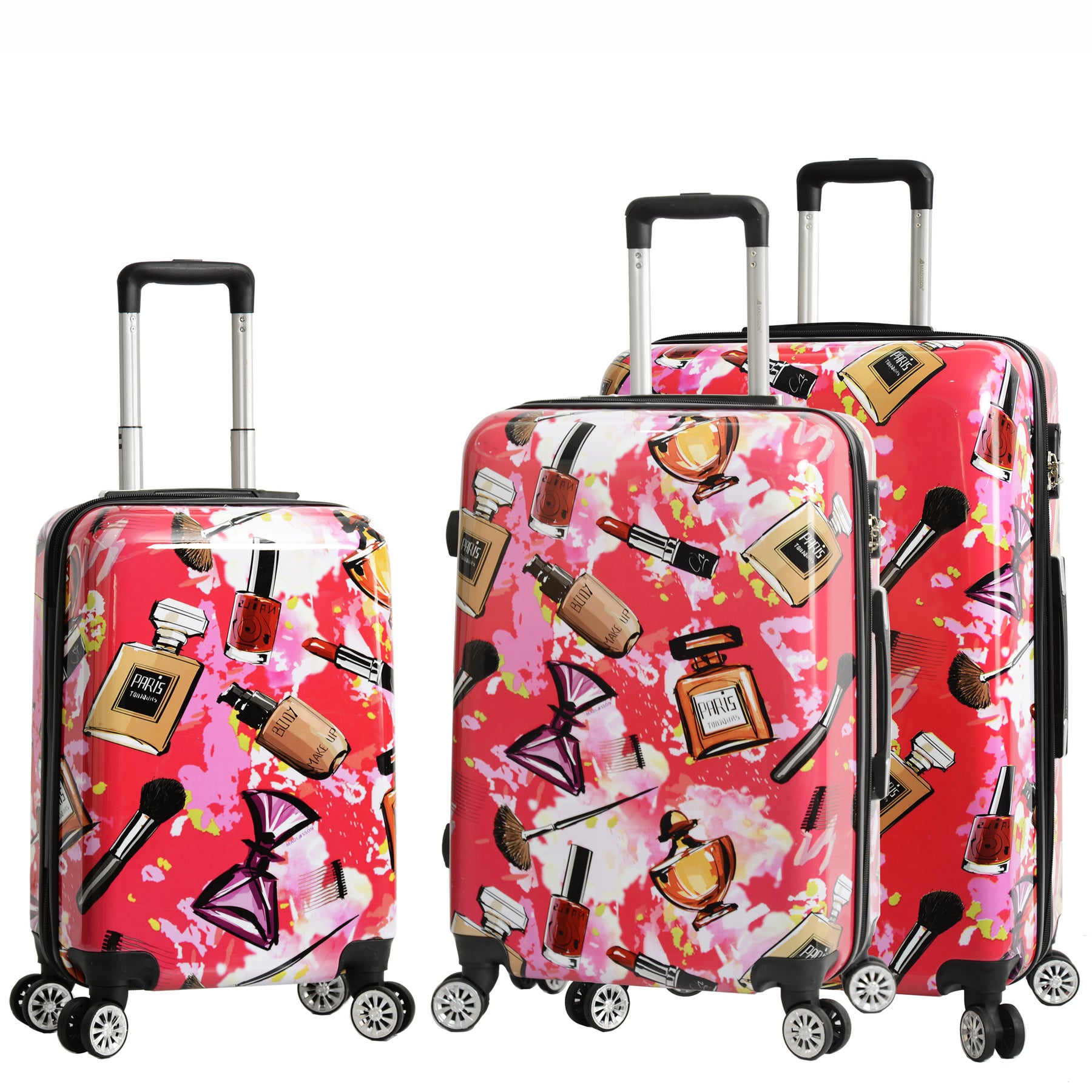 Turn heads at the airport with this eye-catching hard shell suitcase featuring a vibrant make-up print design. Adorned with colourful illustrations of perfume bottles, lipsticks, nail polish, foundation, and make-up brushes set against a bold red and pink splatter background, this luggage is perfect for the fashion-forward traveller. The lightweight hard shell construction offers excellent protection for your belongings, while the expandable design provides extra packing capacity when you need it most. Glide effortlessly through terminals on four smooth-spinning double wheels that rotate a full 360 degrees, making navigation through busy airports a breeze. The sturdy telescopic aluminium handle adjusts to your preferred height for comfortable manoeuvring. A secure 3-digit combination lock keeps your belongings safe during travel. The interior features two pockets to help keep your essentials organised. A stylish and practical travel companion that ensures your luggage is never lost in the crowd.
