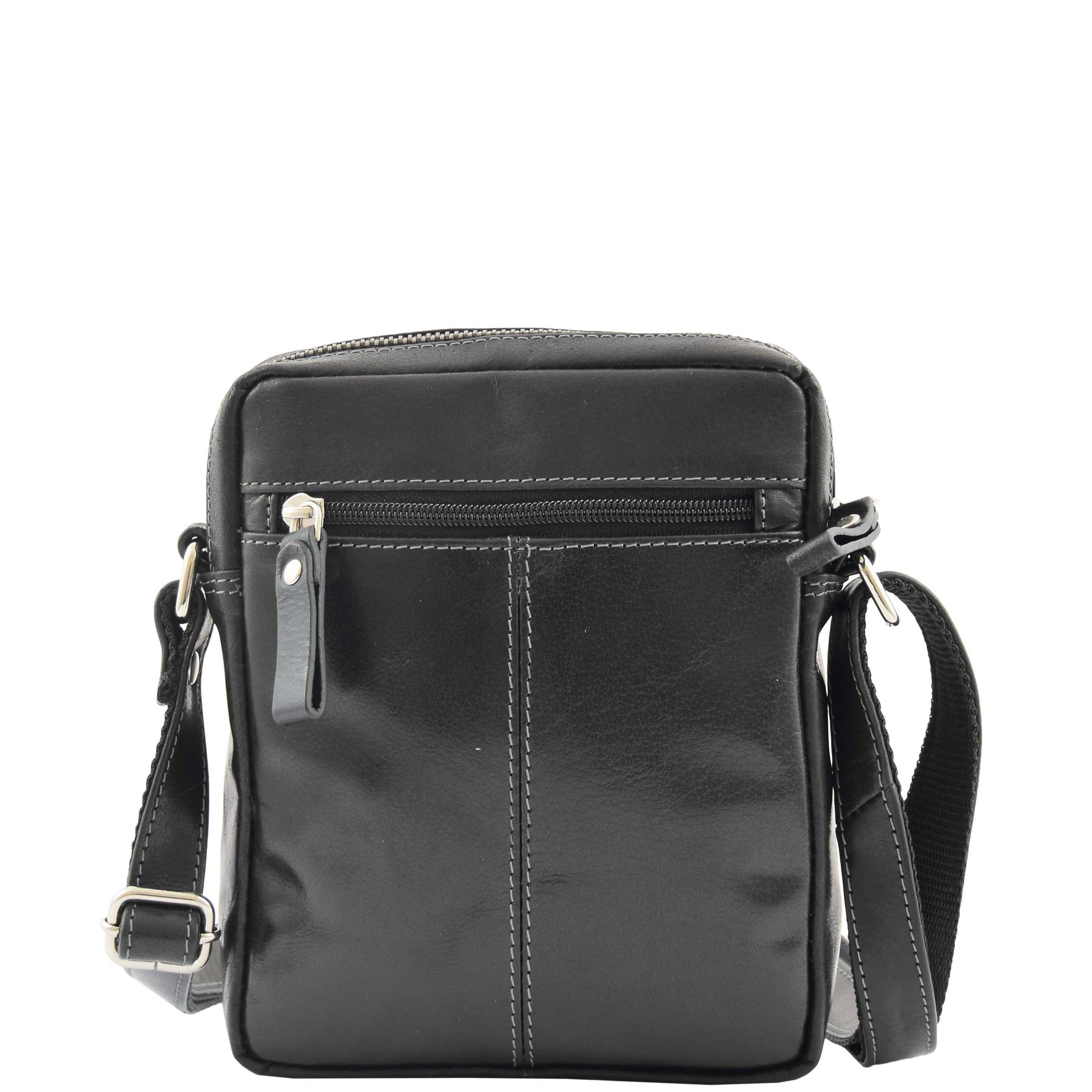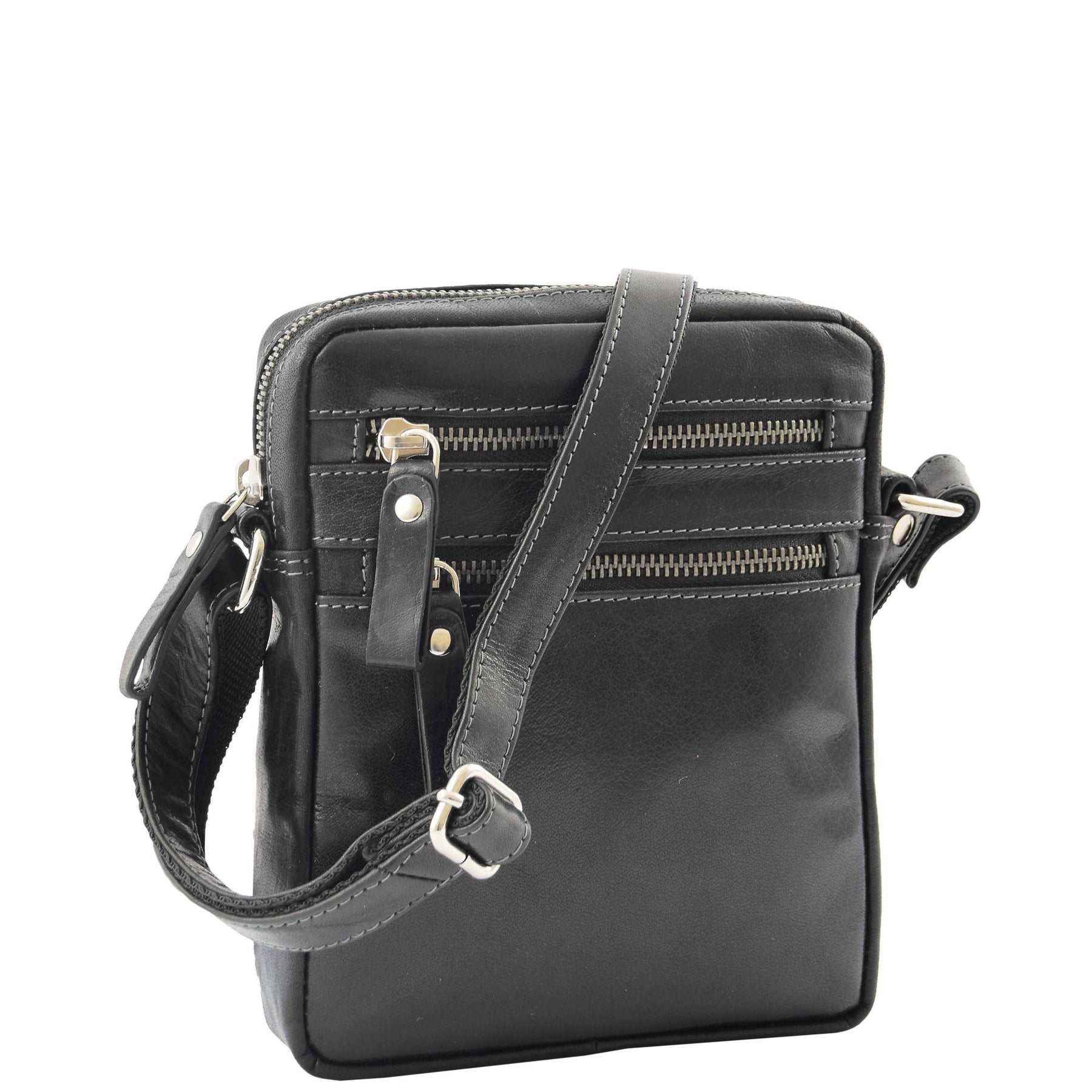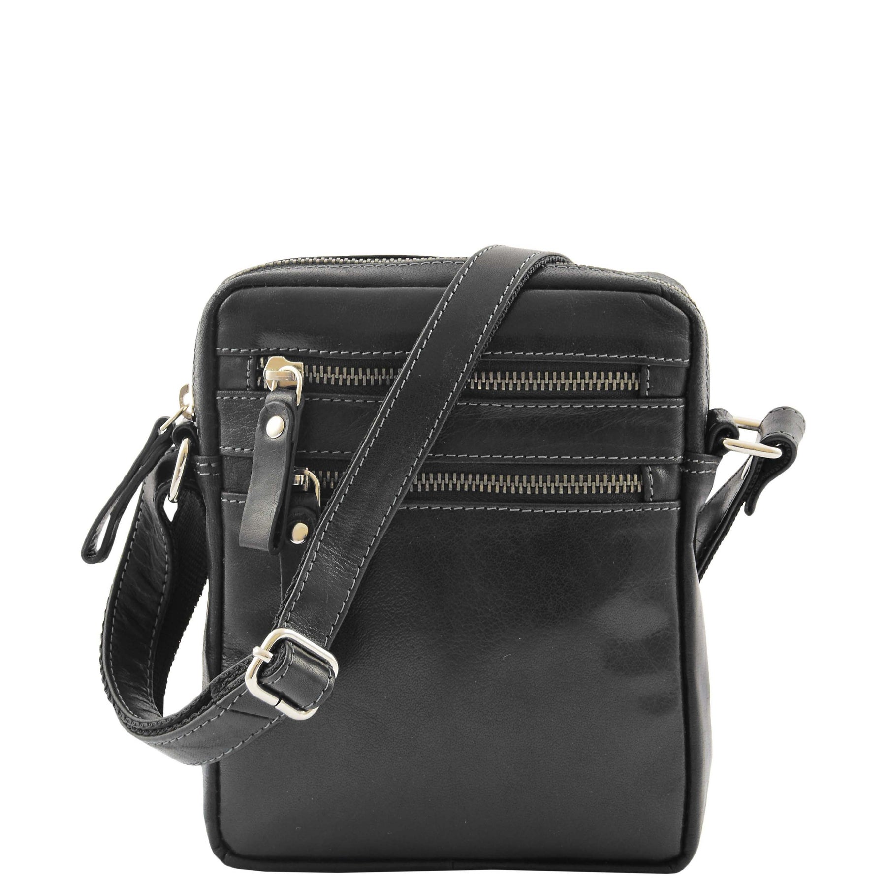 A compact cross body bag for mens, made from smooth touch cowhide leather. It features an adjustable shoulder strap, two front zip pockets, one back zip pocket and a zip top opening.
