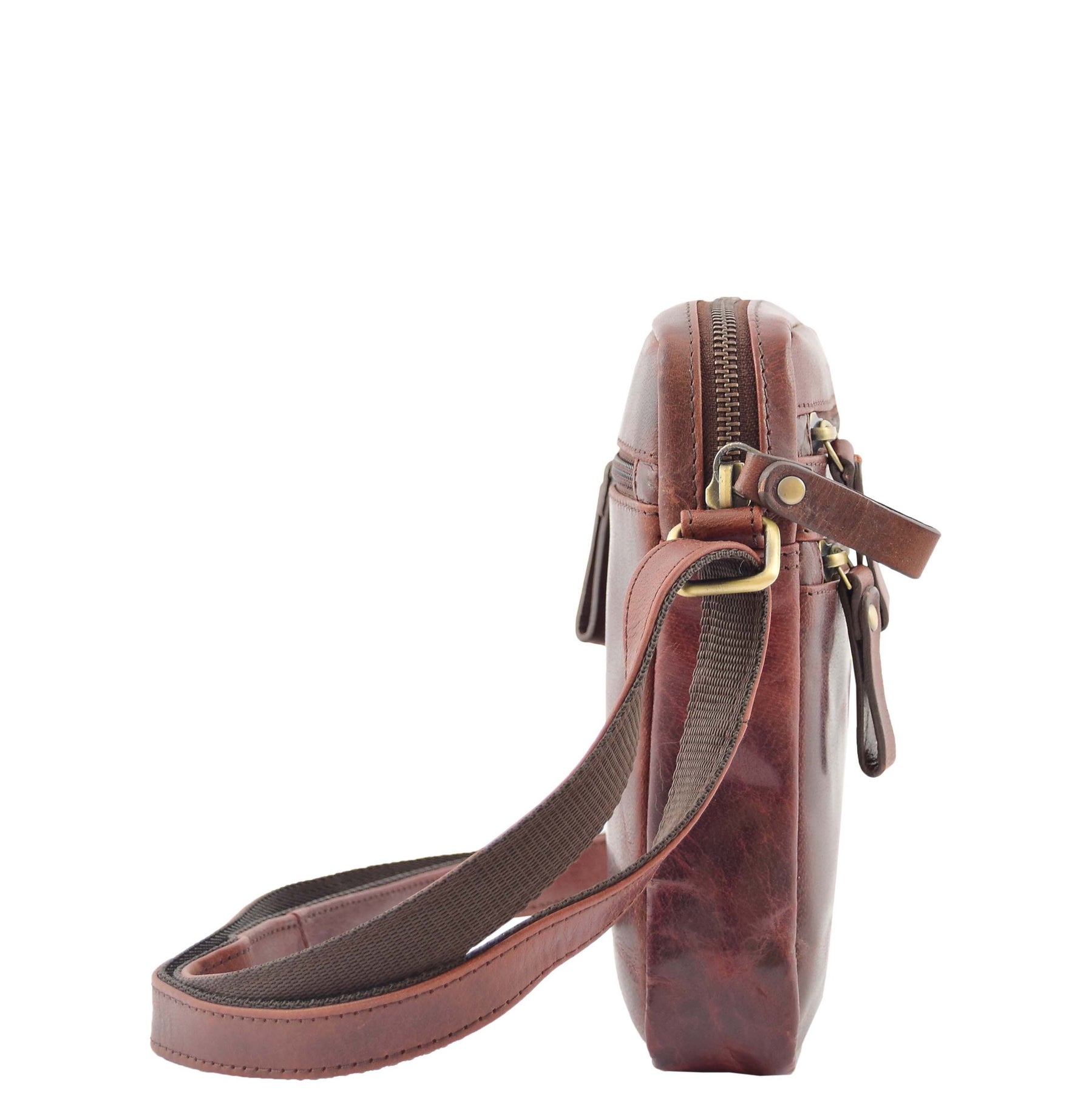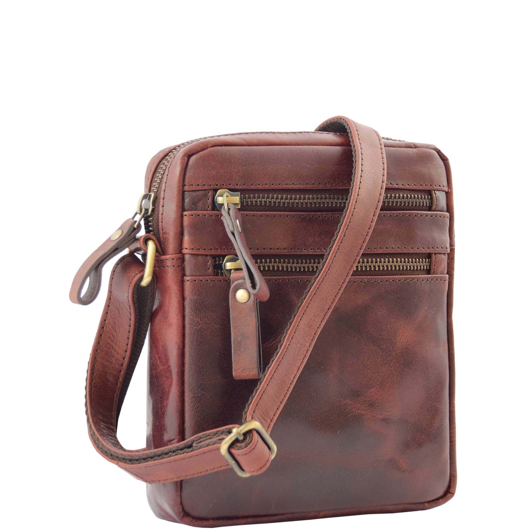 A compact cross body bag for mens, made from smooth touch cowhide leather. It features an adjustable shoulder strap, two front zip pockets, one back zip pocket and a zip top opening.