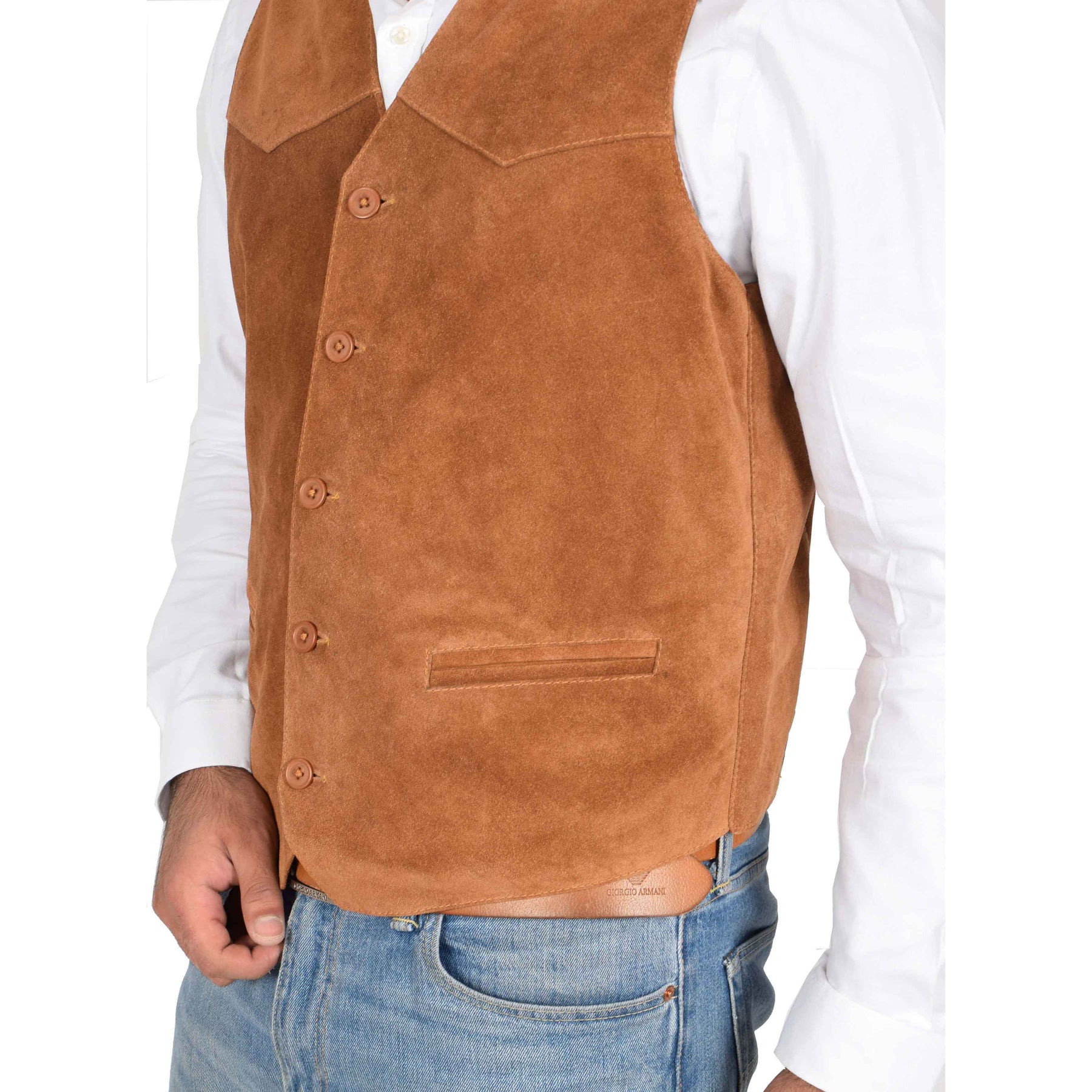 This waistcoat for men's is made from genuine suede ather which is fully lined inside with polyester. It features five front button closure, two front pockets and an adjustable strap on the back to refine the fit.