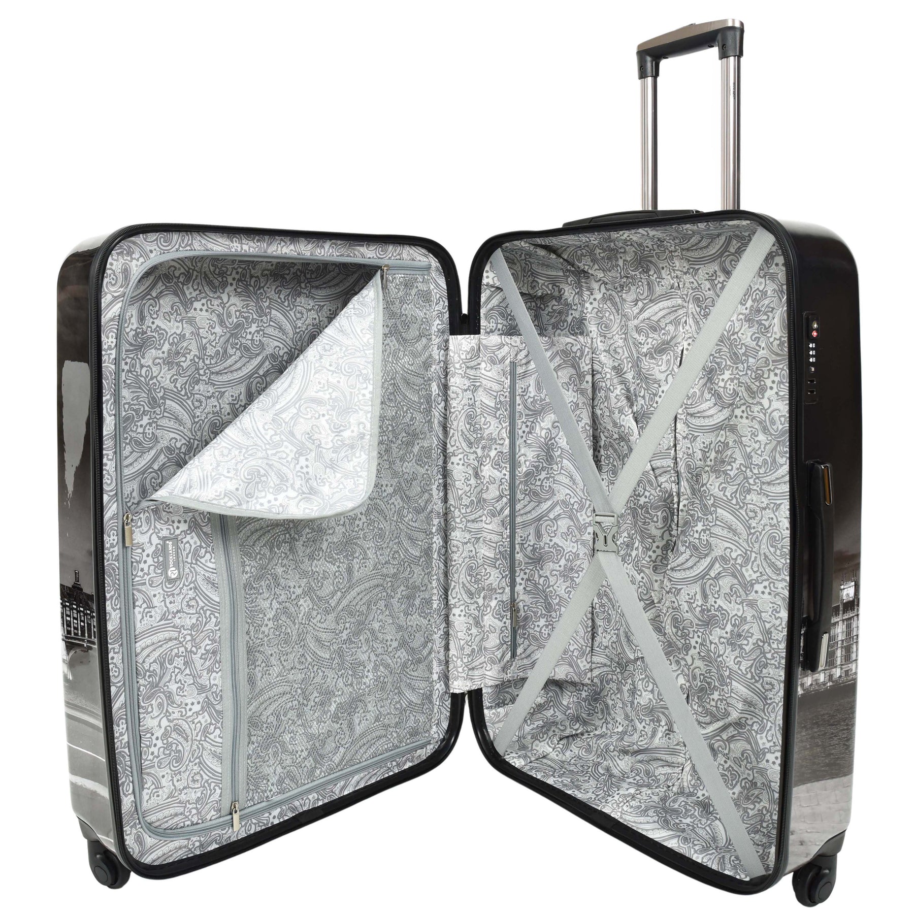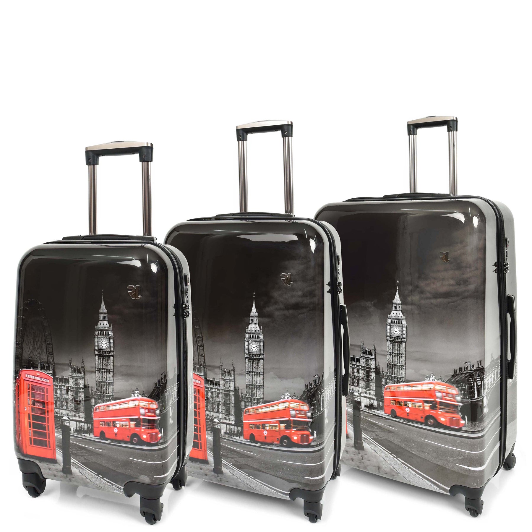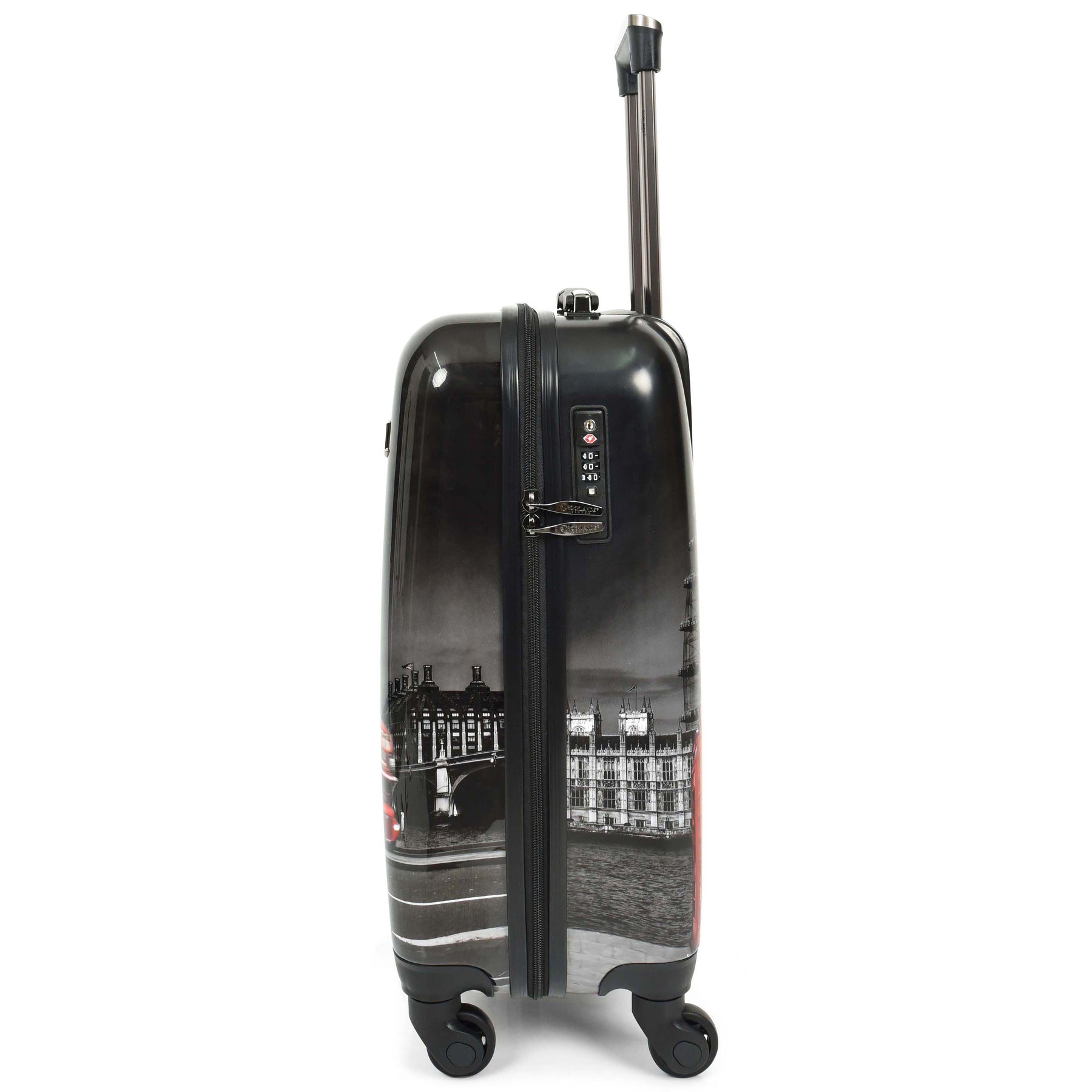 Introducing the London print PC Hard Shell Suitcase – where iconic style meets practicality in a tribute to the heart of England. Adorned with a monochrome print featuring the iconic London backdrop, complete with a red phone box and classic double-decker bus, this suitcase is a nod to the charm of the city.
