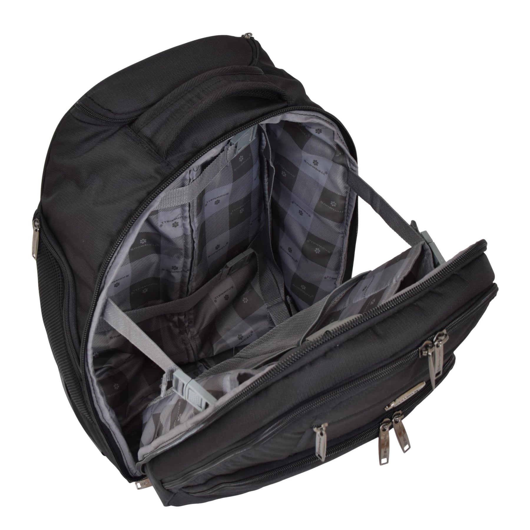 Made from heavy duty polyester and complete with high quality zip pullers and wheels. It features a telescopic handle, top grab handle, adjustable back straps, two front zip pockets with inner organiser sections. There are two main zip compartments, one compartment has two section dividers, the other compartment can be completely folded open and has a dedicated laptop section and packing straps. The wheels have rain covers to protect your clothes if you are using the bag as a backpack.