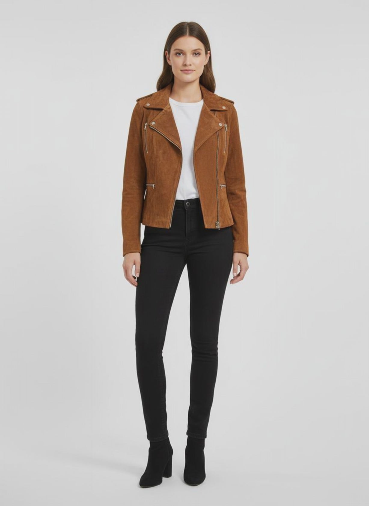 Womens Suede Biker Style Zip Jacket Skylar Tan