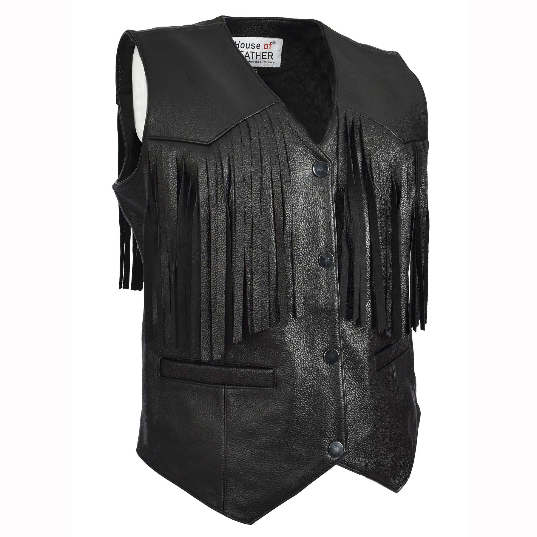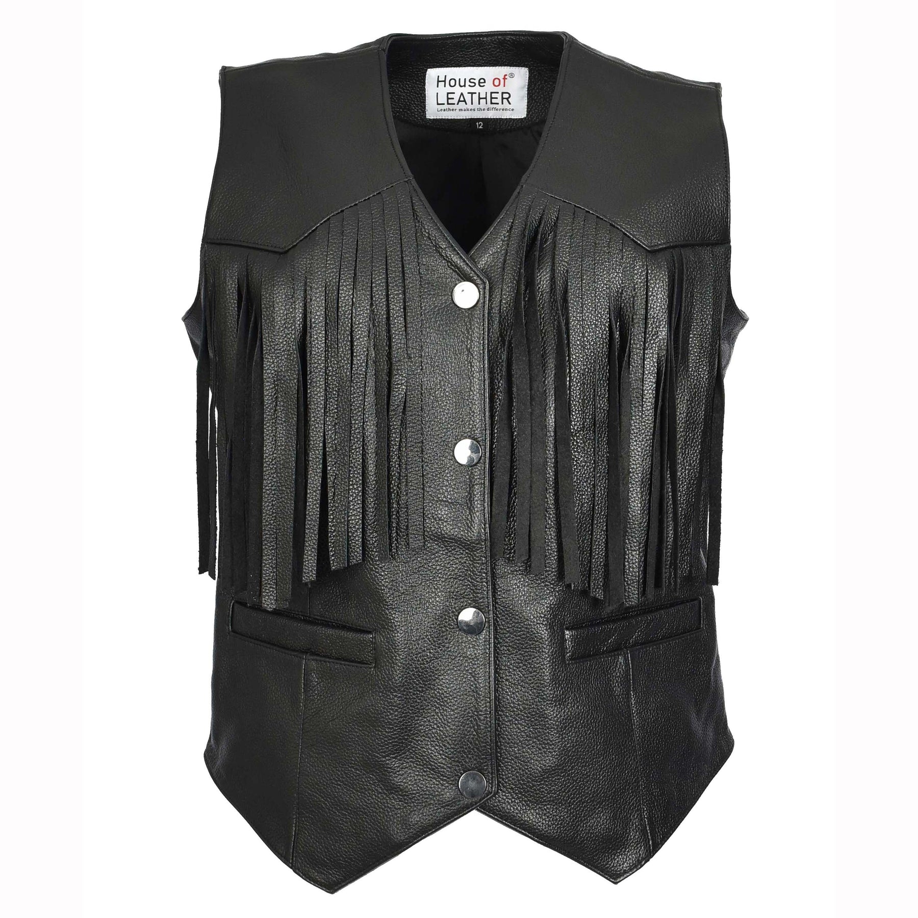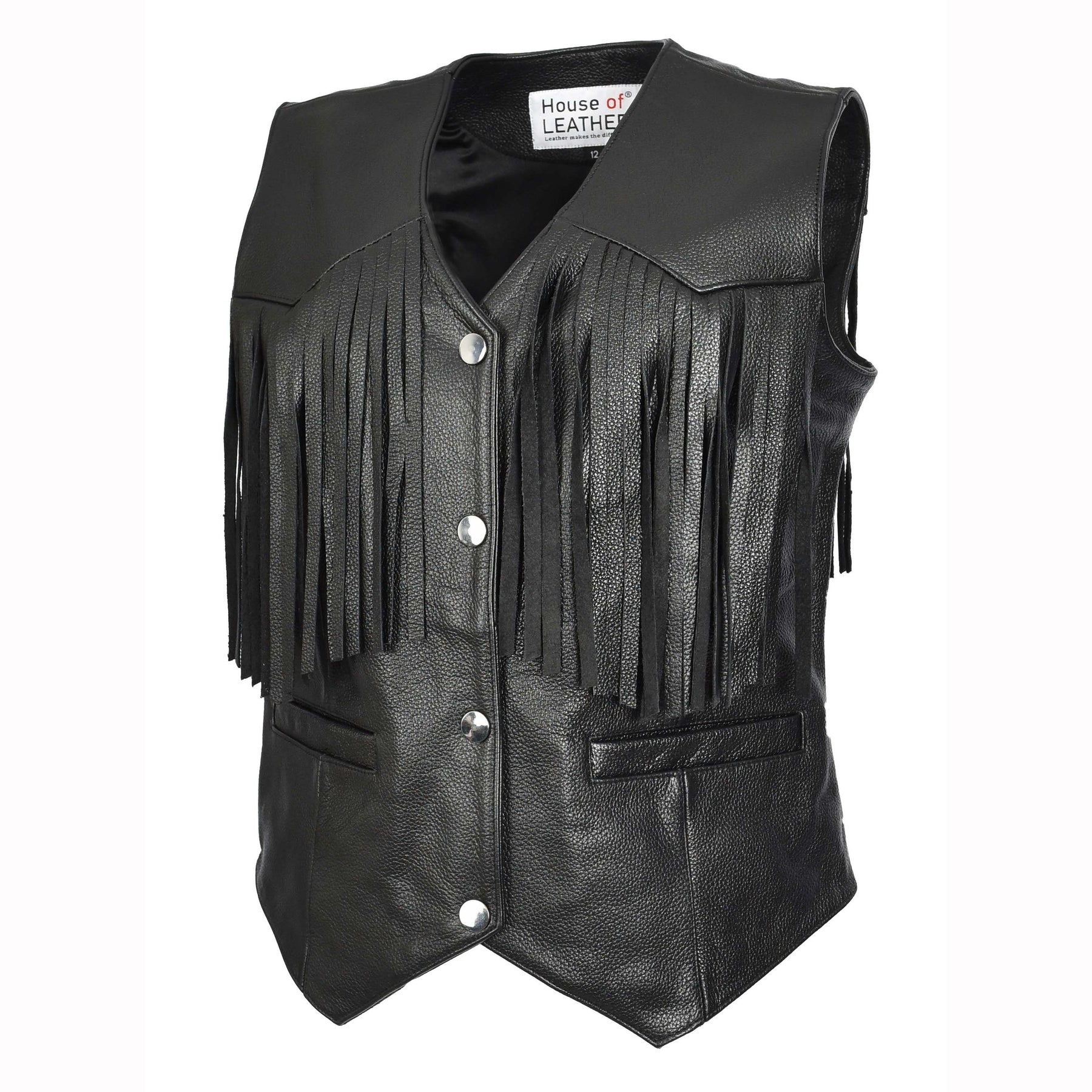 Make a bold statement with this House of Leather women's black cowhide waistcoat from the Raven Collection. This biker-style vest features striking fringe details that add movement and dramatic flair to the classic silhouette. Crafted from premium cowhide leather, the waistcoat showcases expert craftsmanship with its button-front closure, practical front pockets, and thoughtfully placed fringe embellishments along the front and back. The fitted design offers a flattering shape while maintaining comfort and flexibility. Perfect for motorcycle enthusiasts or anyone looking to add an edge to their wardrobe, this versatile piece can be styled with everything from jeans to dresses. The rich black colour and quality construction ensure this waistcoat will be a lasting addition to your collection, developing character with wear while maintaining its distinctive appearance. The traditional vest cut allows for easy layering in various seasons, making it a practical yet stylish choice for the fashion-forward woman.
