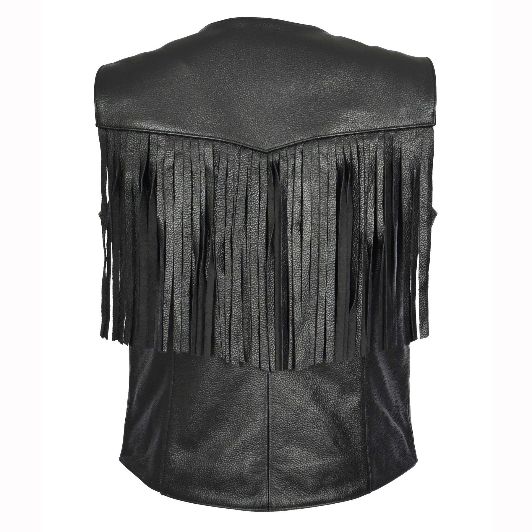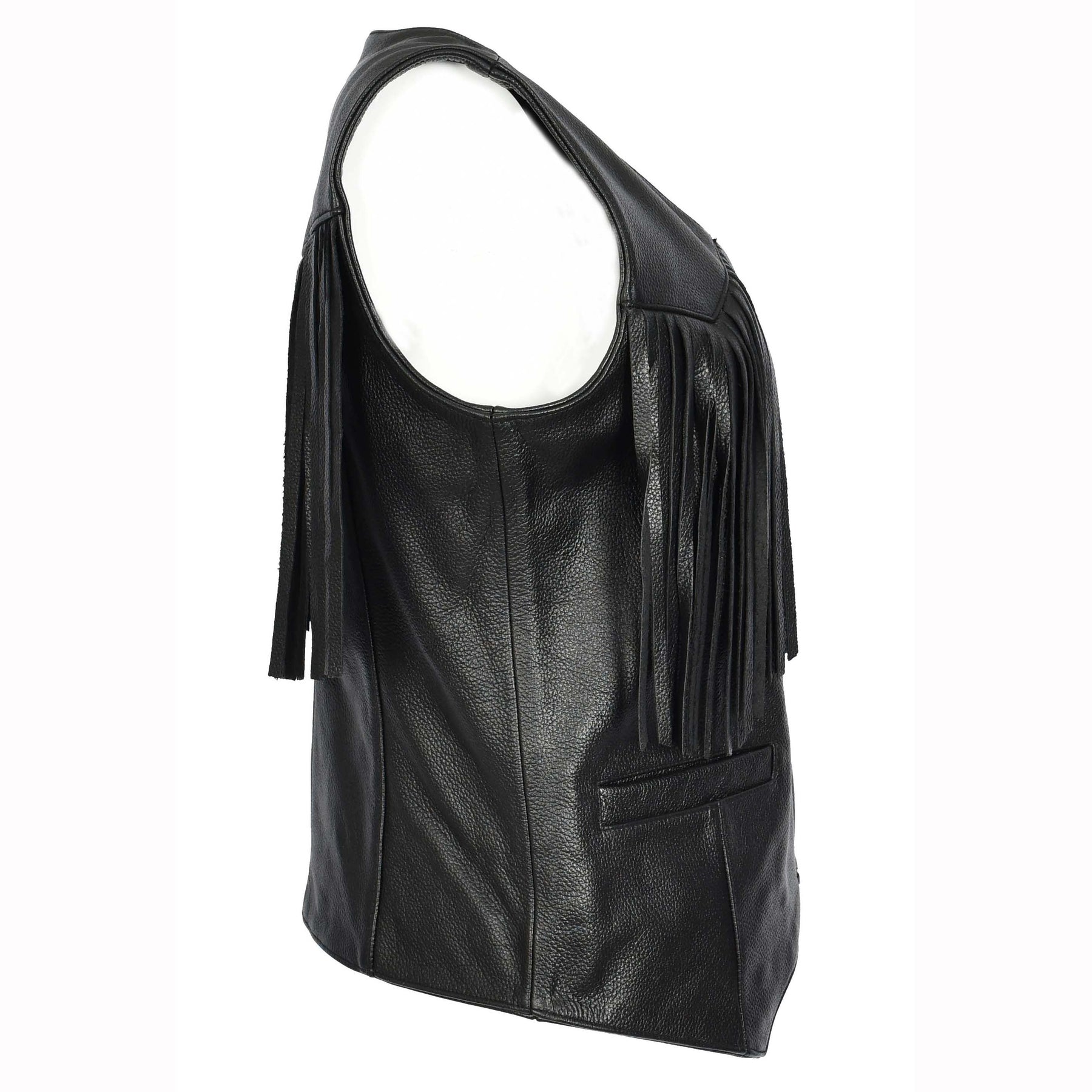 Women's Black Cowhide Leather Waistcoat Rider Biker Style with Fringe Details, Raven