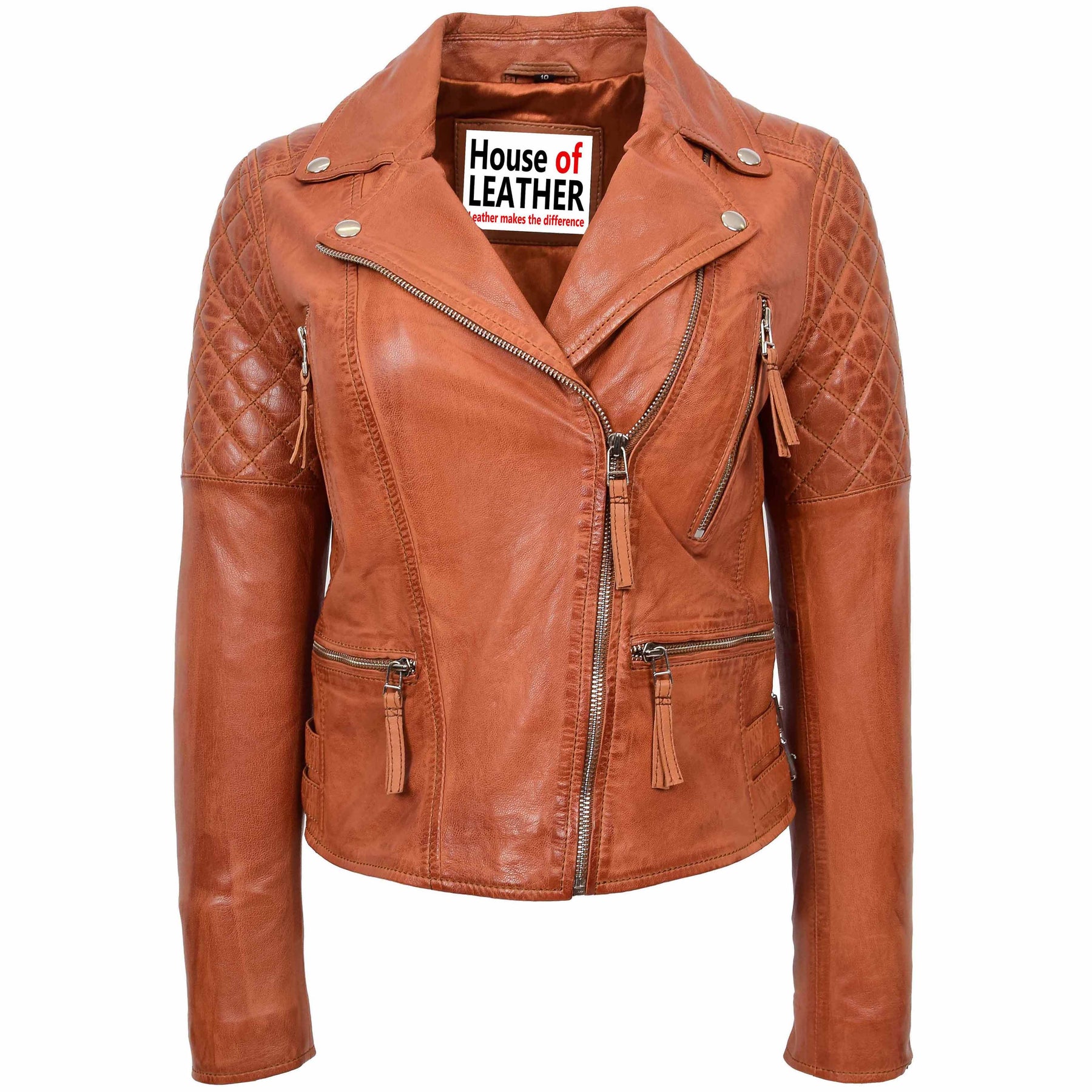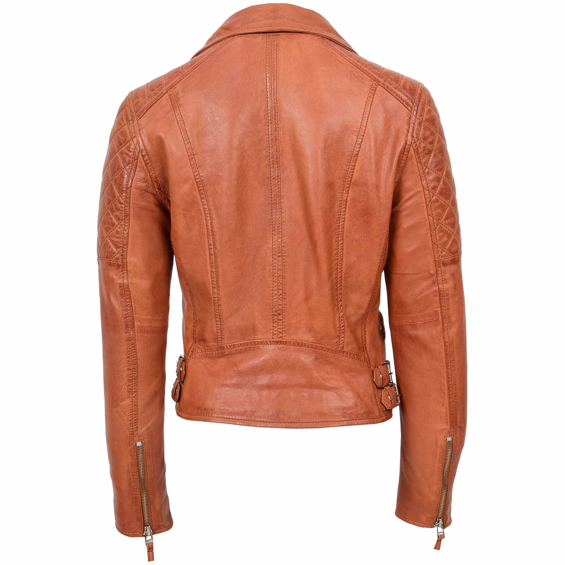 Womens Cross Zip Biker Leather Jacket Claudia Cognac