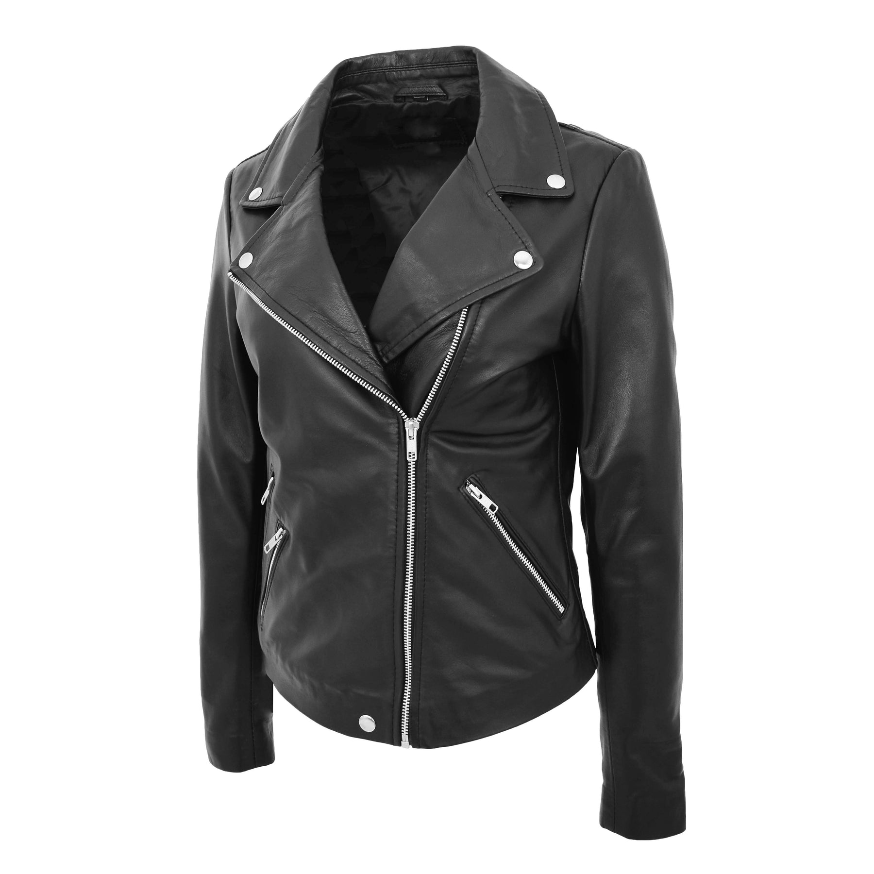 Womens Leather Biker Style Jacket Cross Zip Maya Black