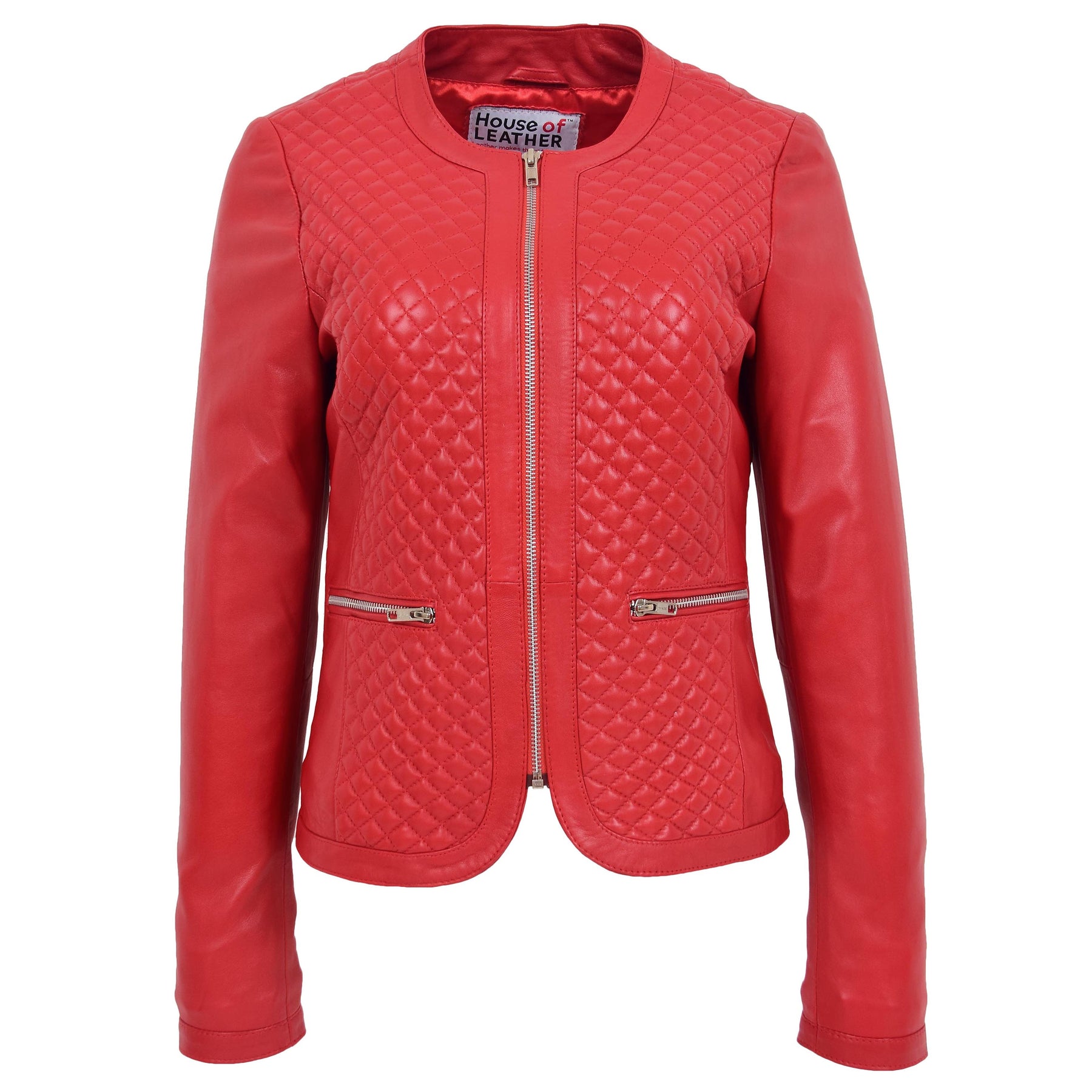 Womens Leather Collarless Jacket with Quilt Design Joan Red 6