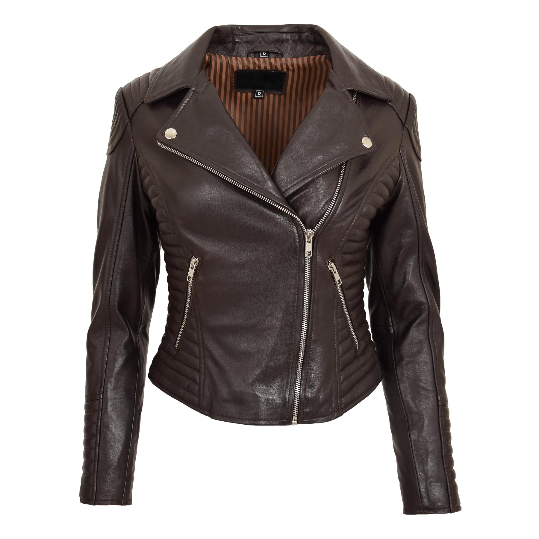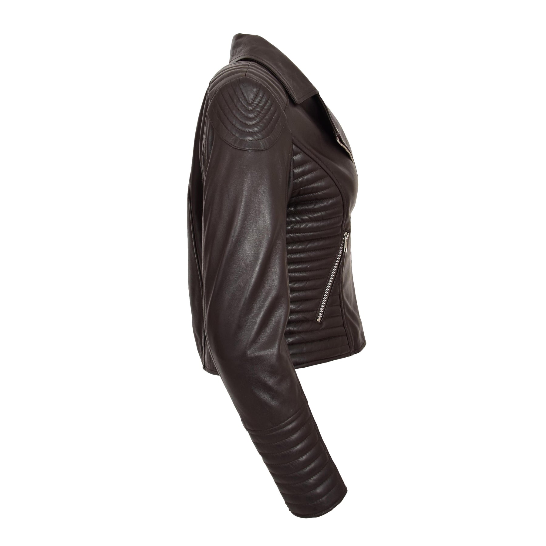 A gorgeous biker style jacket for womens made from soft touch sheep nappa leather, there is quilting along the waist, cuffs and shoulders which maintain the classic biker look and feel. It features a cross zip fastening, two outer pockets and zipped cuffs. Inside polyester lining.
