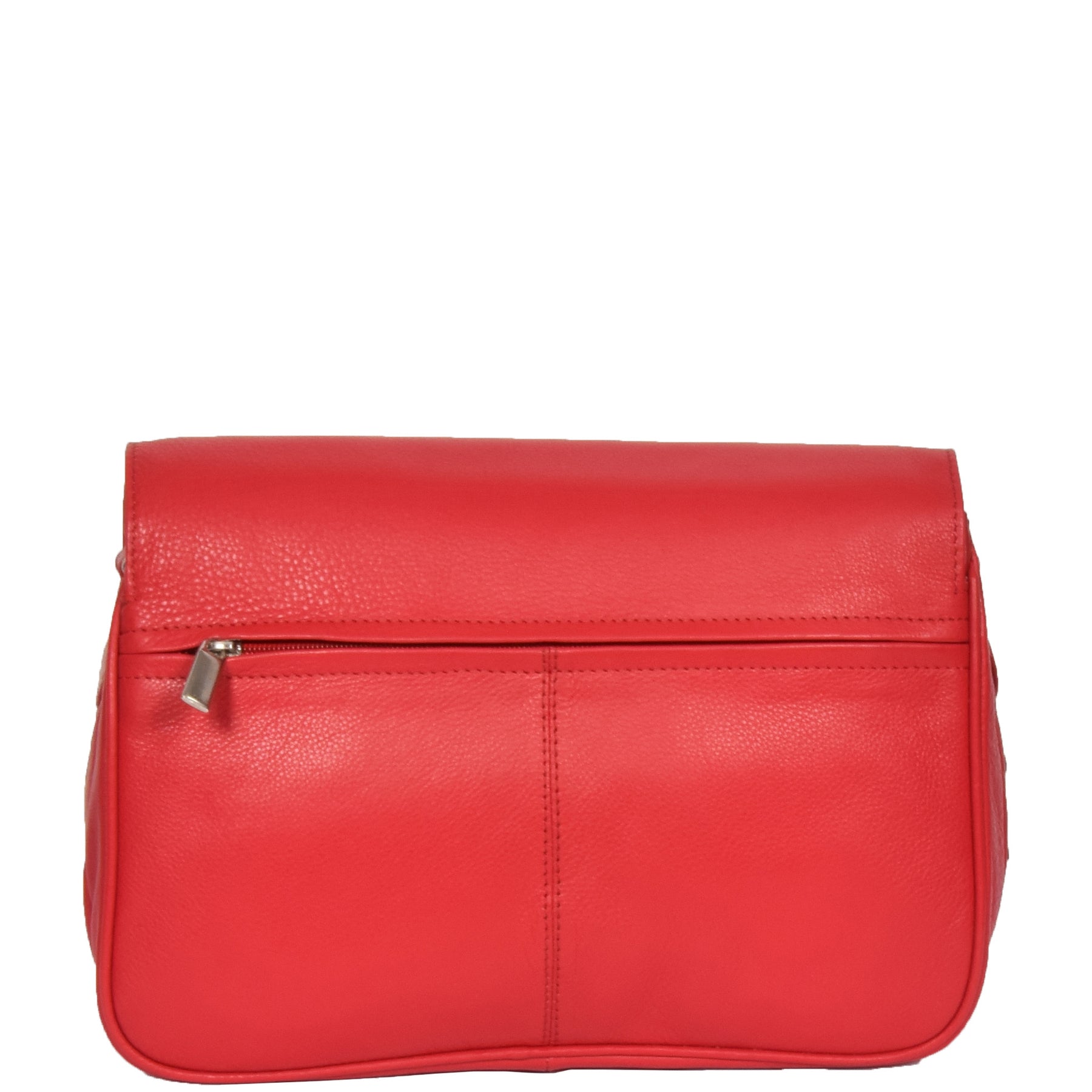 Classic flap over cross body bag for womens made from full bodied cow leather for extra durability. It features an adjustable shoulder strap, back zip pocket, magnetic flap over closure, under the flap closure are four open compartments and pen holders. The main inner compartment has two middle zip divider pockets.