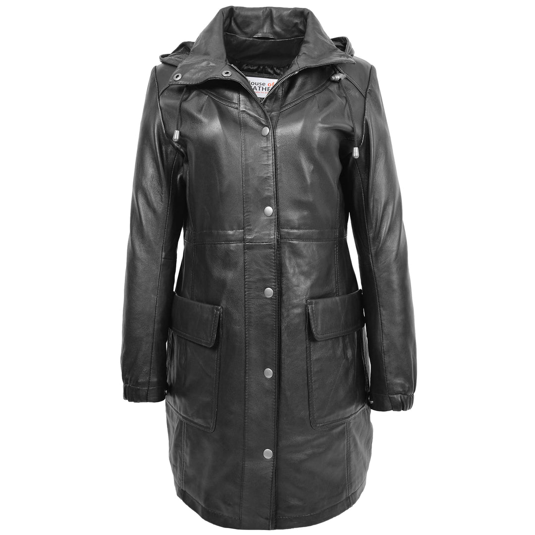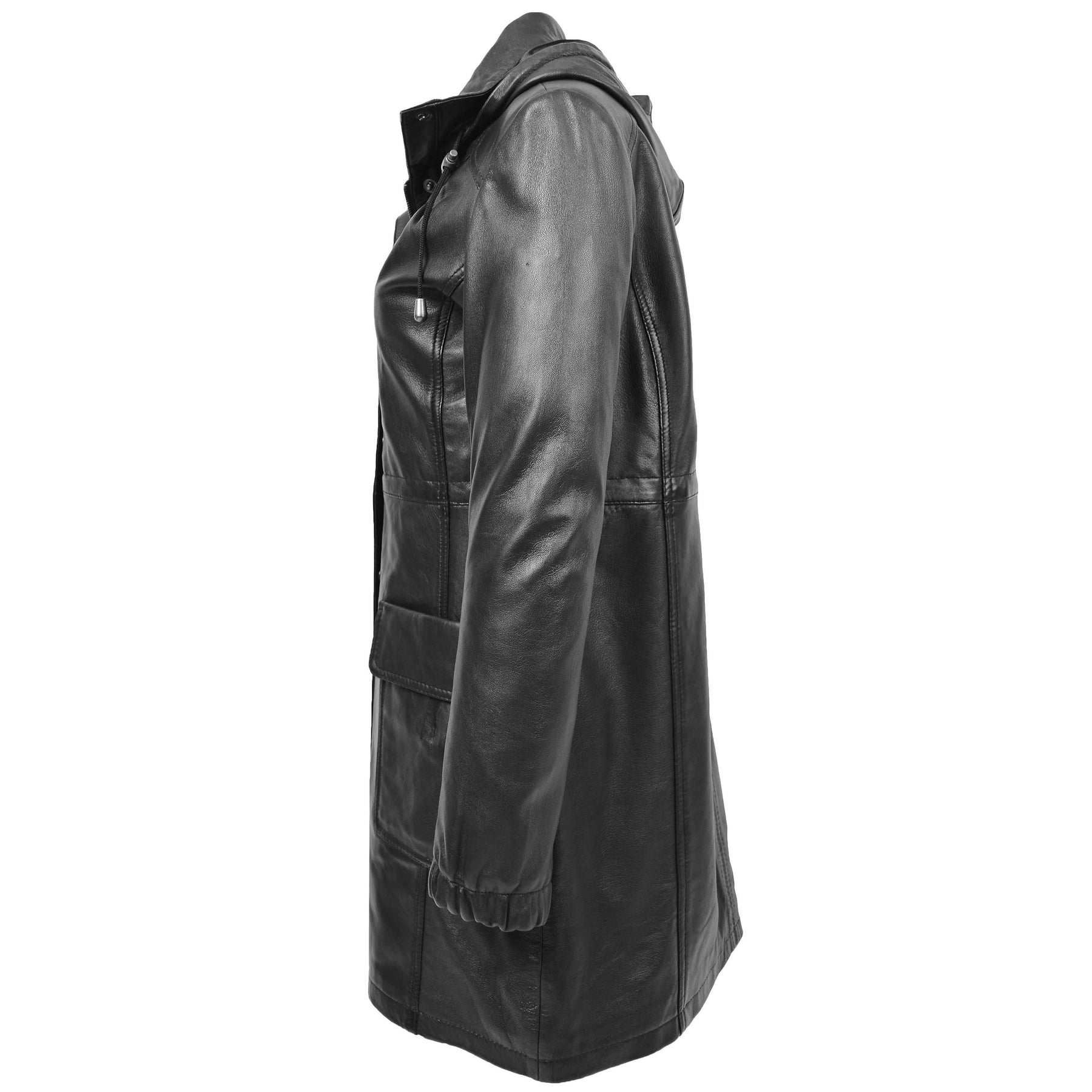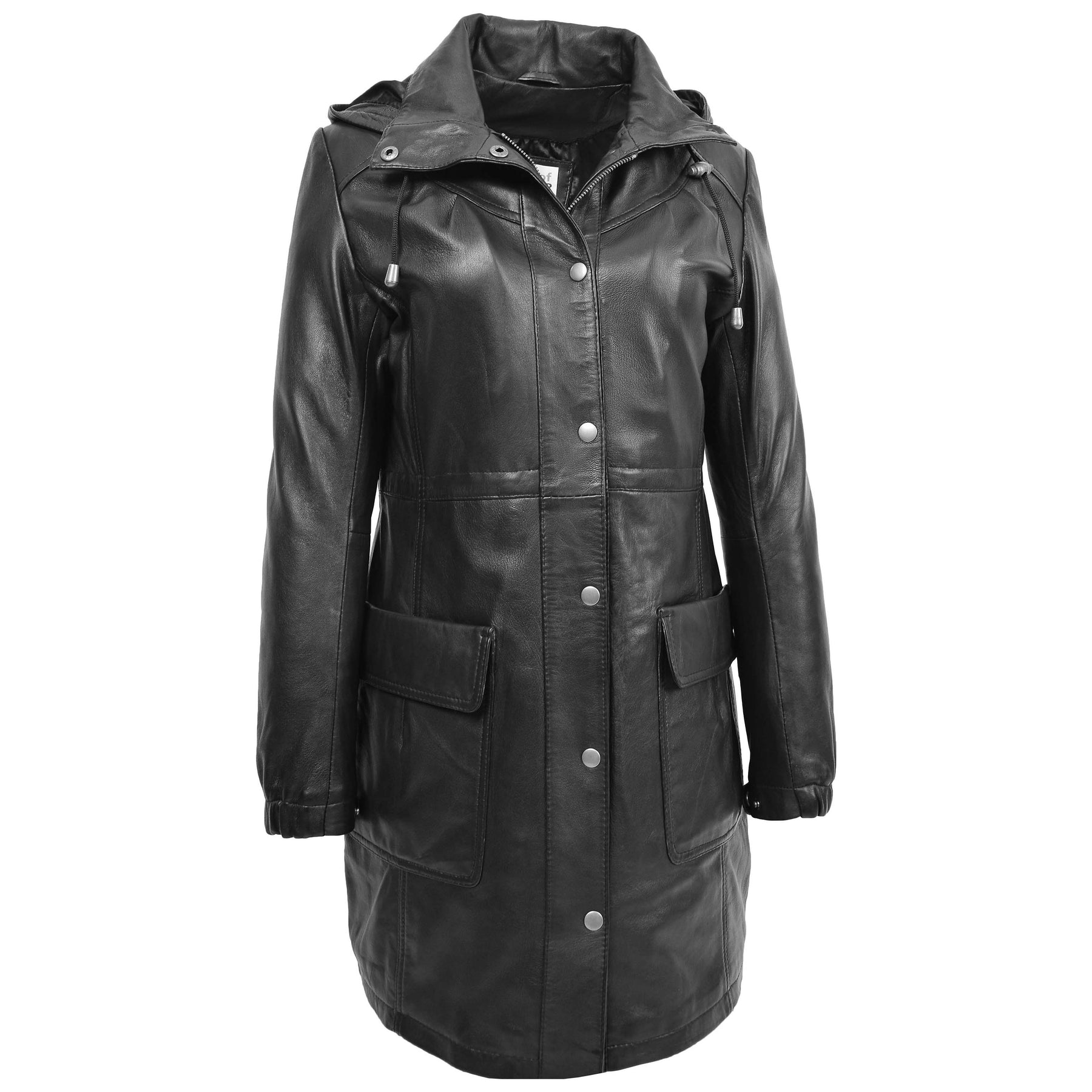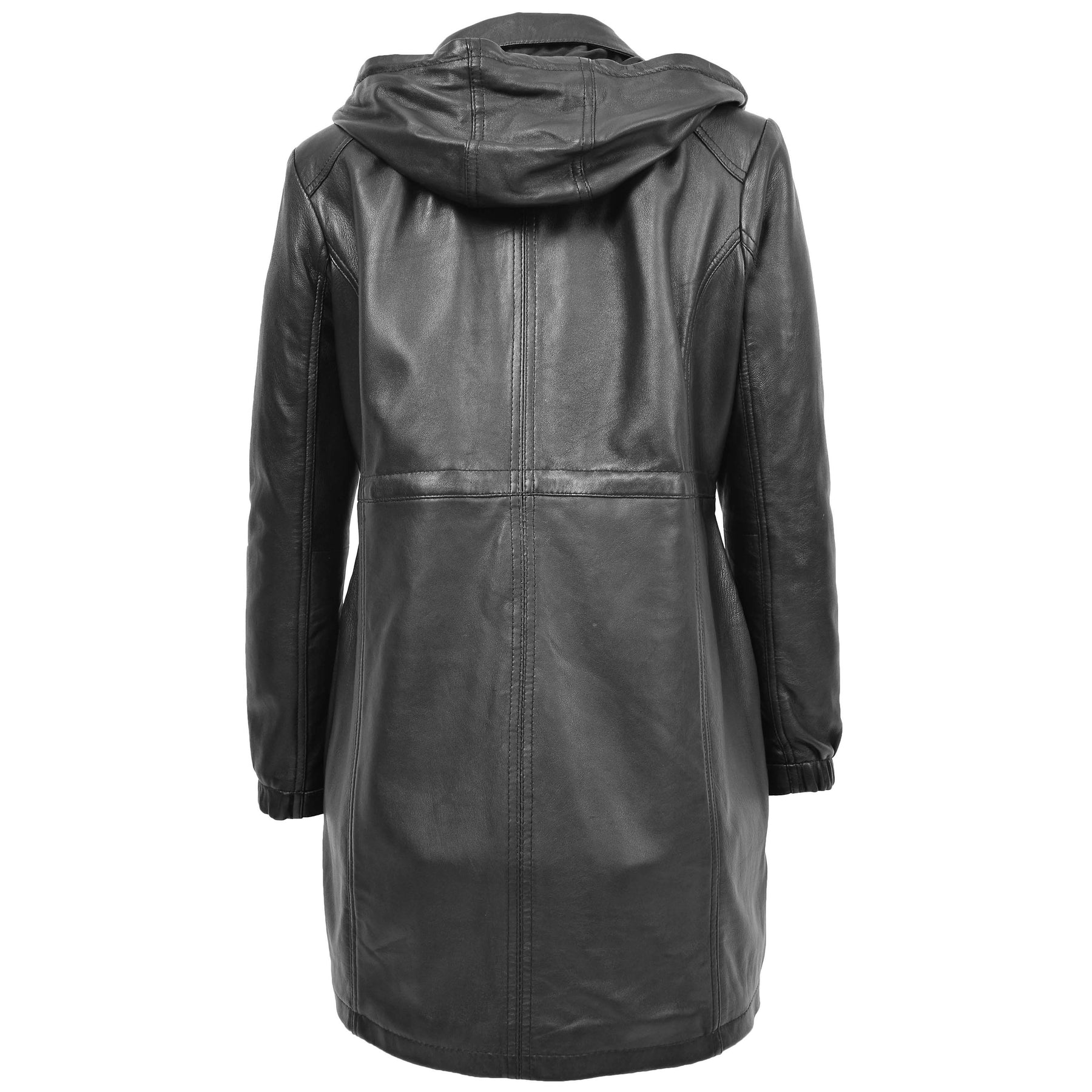 A womens top quality real leather hooded duffle coat, this jacket has a lot to offer, made from super soft & light lamb nappa leather. It features a removable hoodie with drawstring, two front large patch pockets, front zip fastening with a popper button fly and an adjustable drawstring for the waist. Inside polyester lining.