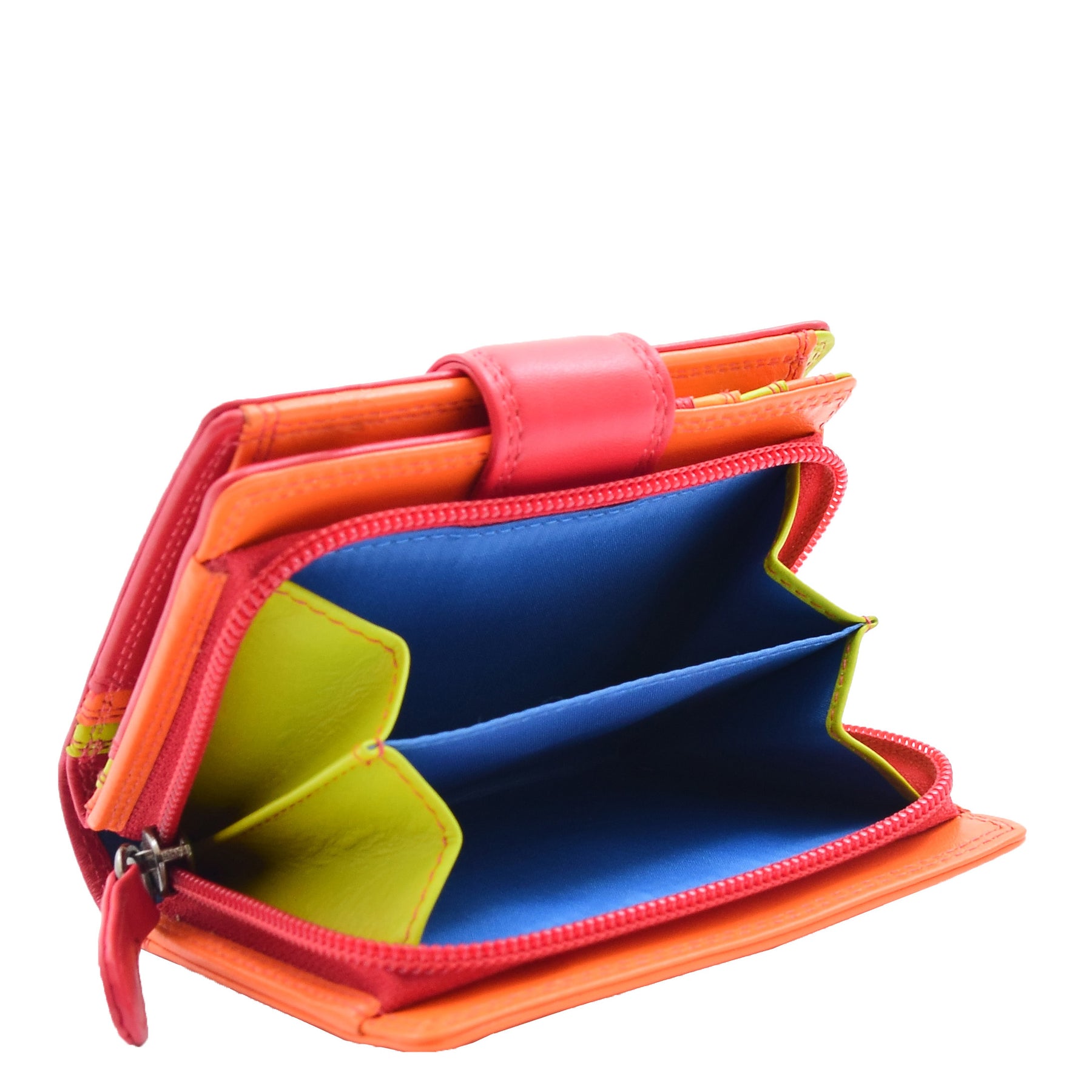 A fantastic multicoloured mid-sized purse for womens. Made from top quality soft touch cowhide nappa leather with an eye catching multicolours and finished off with double edge neat and reinforced durable stitchings, It features bifold style with a snap buttoned strap closure, it opens to reveal thirteen credit card slots, a clear photo ID section, bank notes section and zip pocket with a mid divider for small coins loose change, fully lined interior with a high quality polyester.