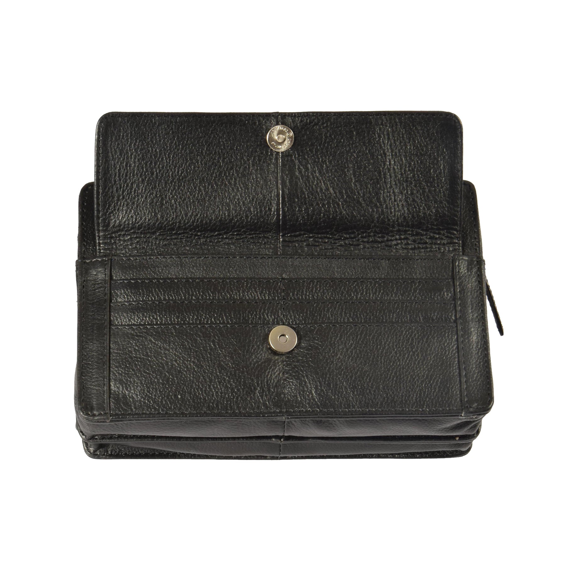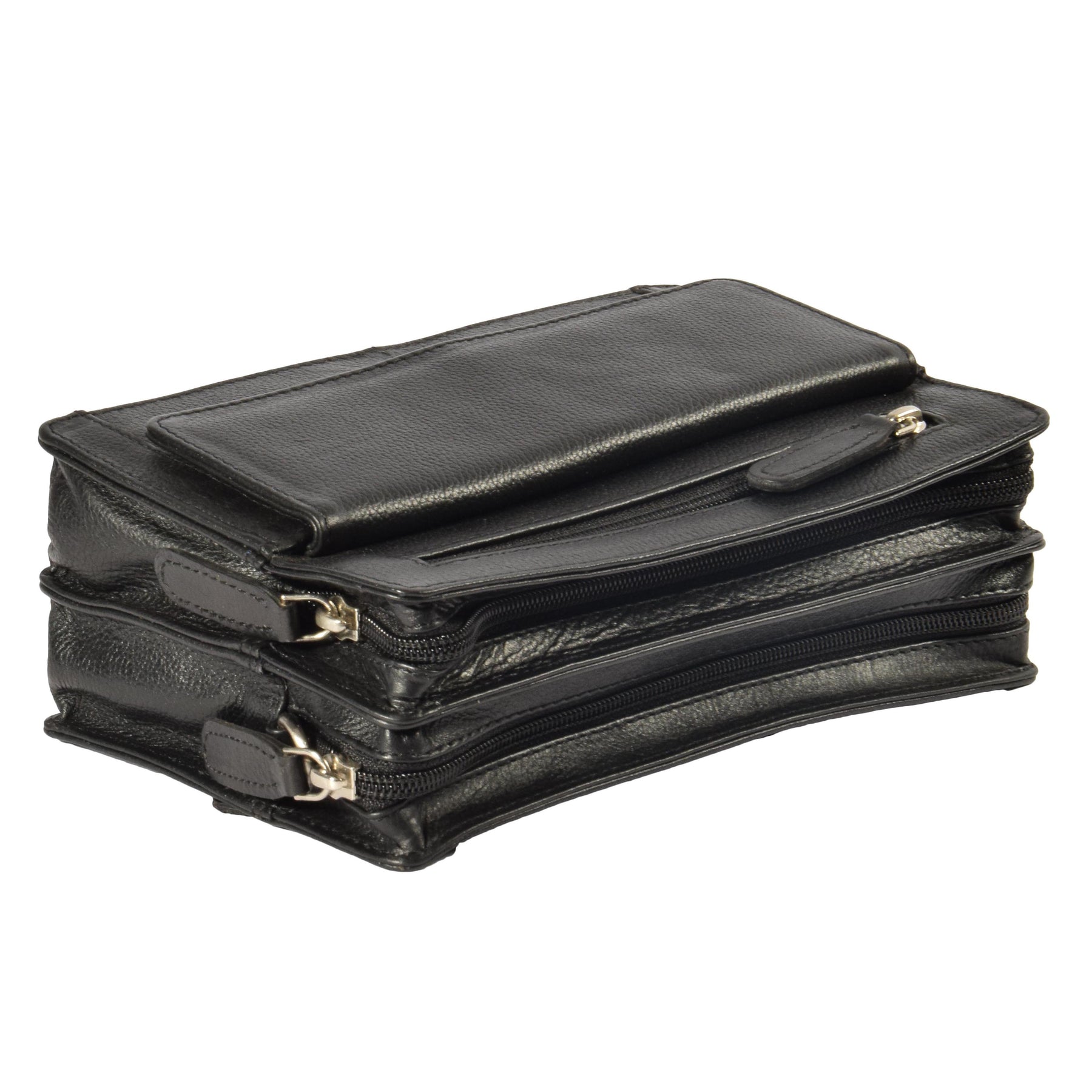 A fantastic leather pouch with a wrist strap makes this bag portable and easy to carry. This bag is made from durable cow natural grain leather. The wrist bag features two zip top openings, detachable wrist strap, two front pockets, one front pocket is zipped and the other flap pocket has six inner card sections, two back pockets, one back pocket is zipped and the other pocket is able to carry a phone.