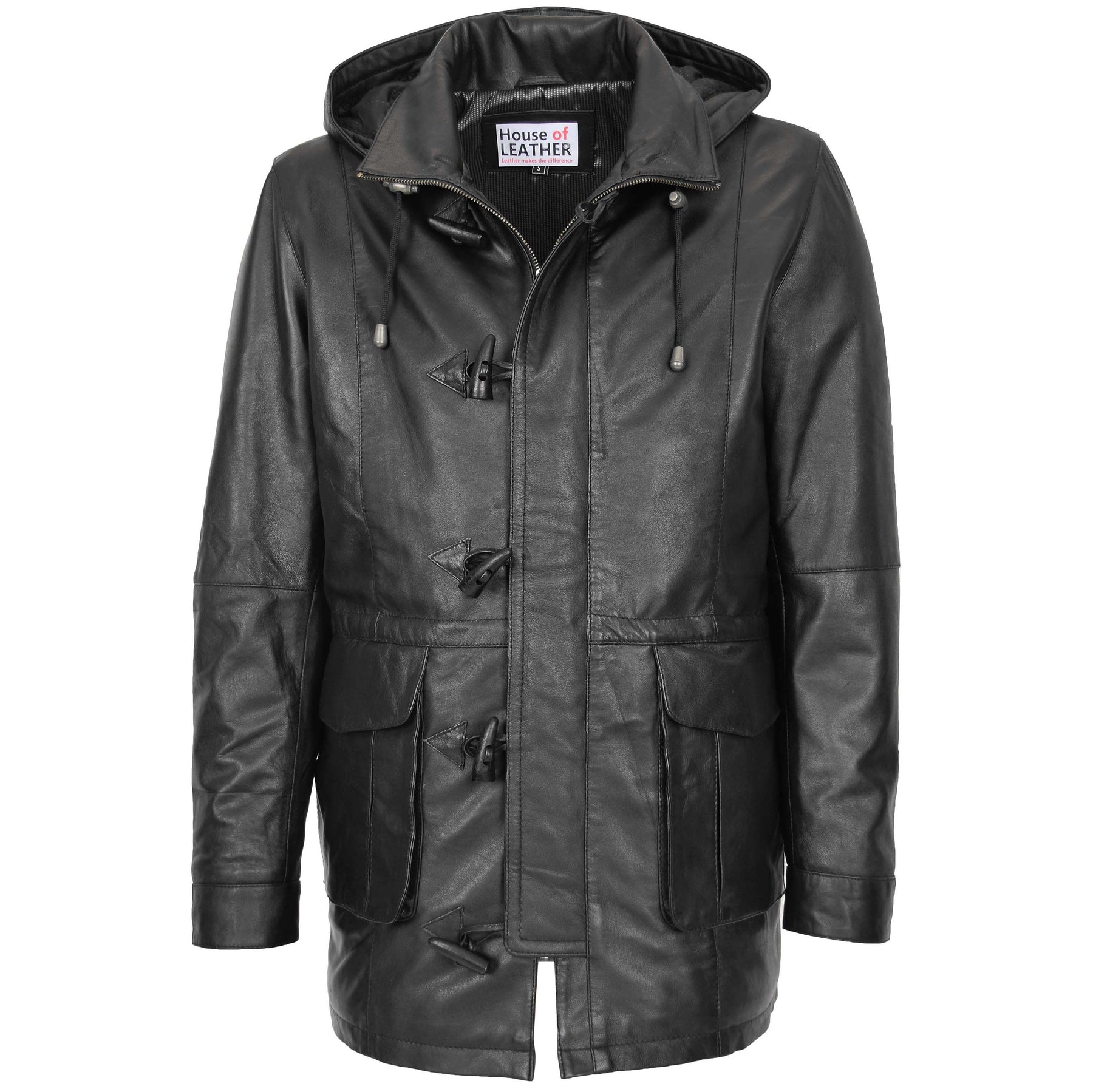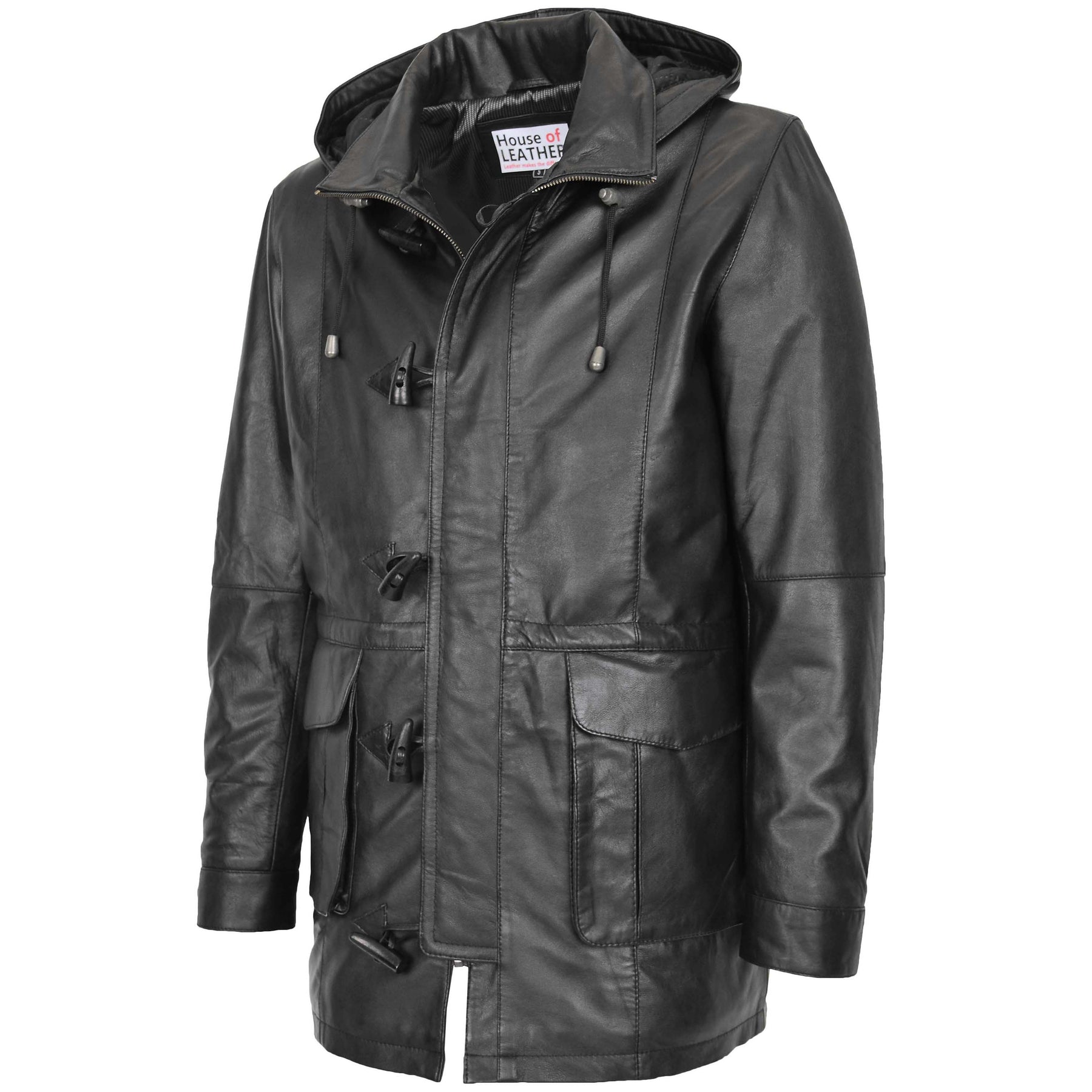 Mens Leather Duffle Coat with Hoodie Jack Black
