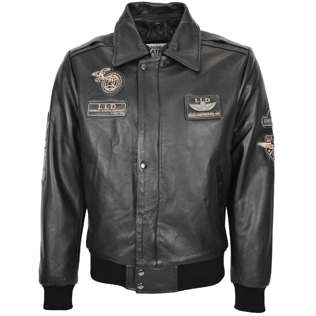A classic aviator bomber jacket made from heavy duty smooth touch cow raisin leather and decorated with air force badges to complete the look. This jacket features a front snap button fly covering the YKK zip fastening, elasticated waist and cuffs, two front pockets and a detachable collar. Inside the jacket it is fully lined with polyester.