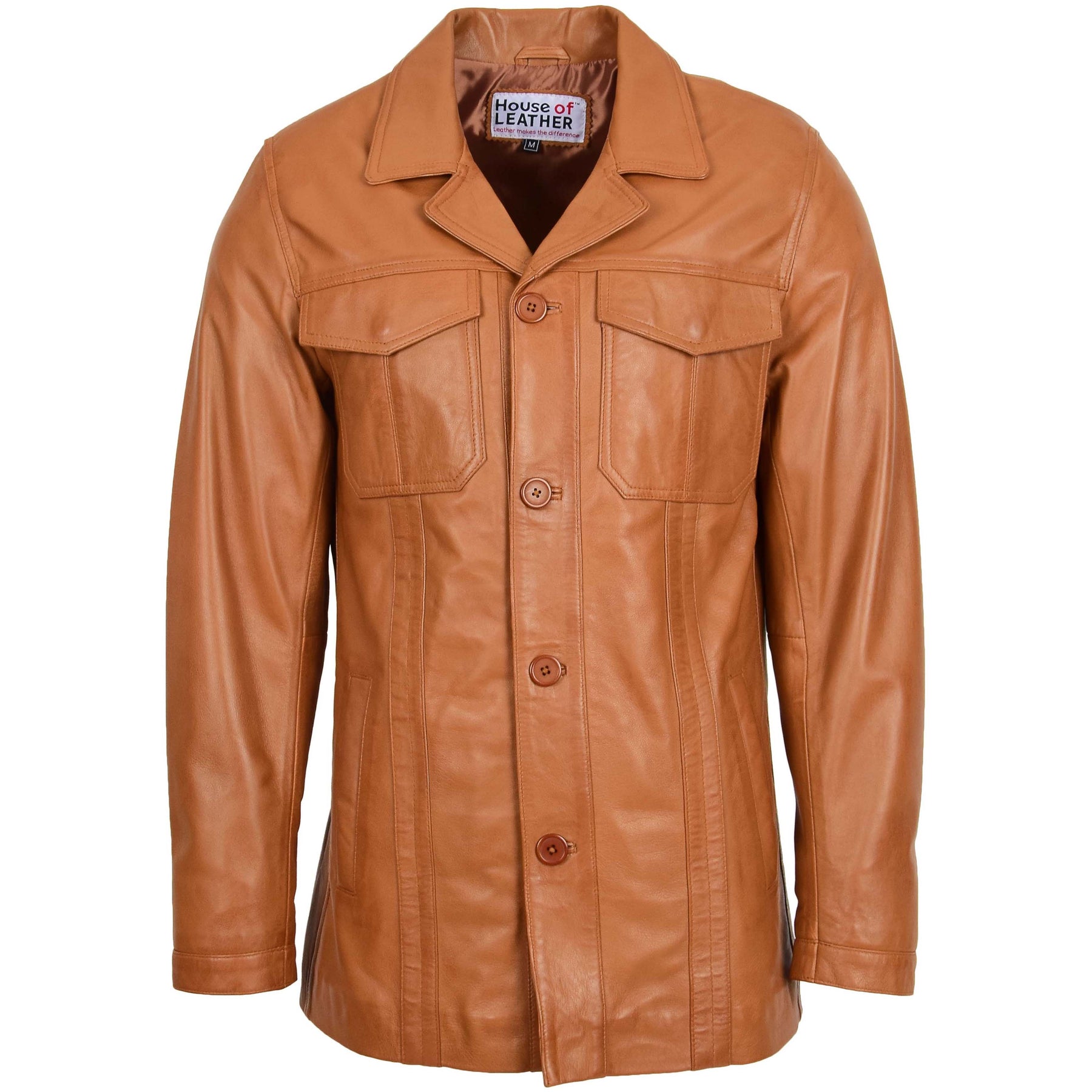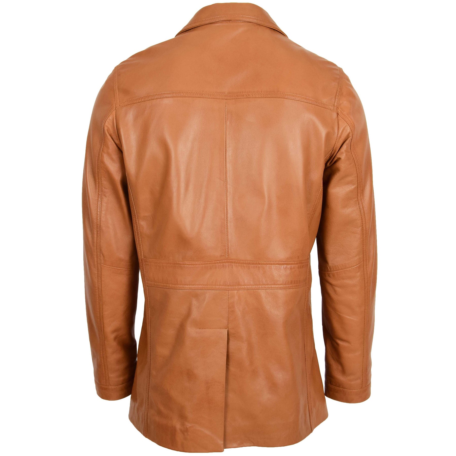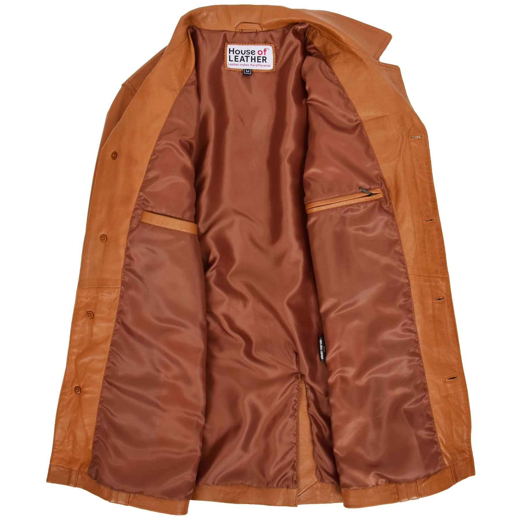 A premium tan leather reefer jacket for mens. Made from soft sheep nappa leather. This jacket features a front button fastening and four outer pockets. Inside polyester lining.