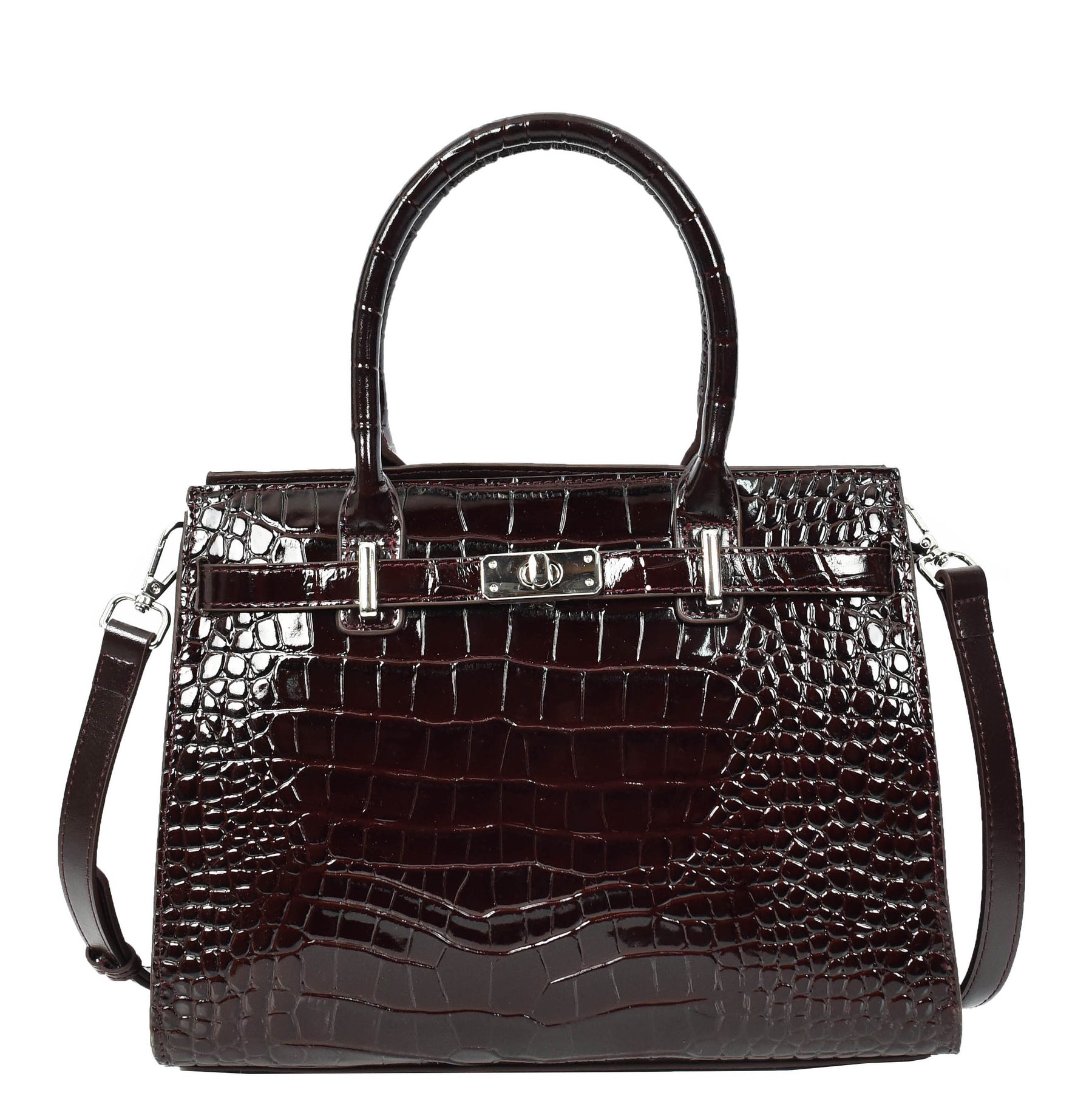 This handbag makes a bold fashion statement. The bag's thoughtful design includes a secure turn-lock closure, polished silver-tone hardware, and a detachable shoulder strap for versatile carrying options.