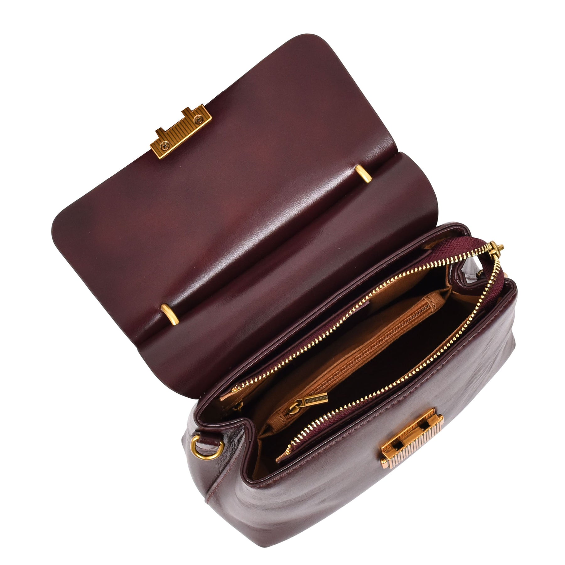 Elevate your accessory collection with our Women's Leather Top Handle Bag, designed for the sophisticated woman who values both style and practicality. Crafted from genuine real leather, this small top handle bag offers a timeless and elegant design, perfect for any occasion. It features a long detachable shoulder strap, a top carry handle and four bottom metal stabilisers. It has a buckled flap and zip top closure. Inside there is a middle zip divider section, one open top pocket and a further zip pocket.